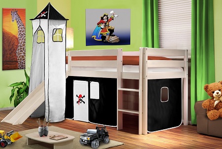 Die Rutsche verleiht dem Bett eine spielerische Note und regt die Fantasie der Kinder an. Sie können das Hochbett als Festung, Schiff oder Schloss sehen.